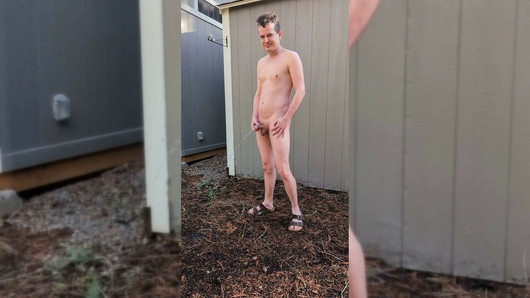 Muškarac spušta pidžamu i drka svoj mlohavi kurac dok se ne uspravi i ne svrši, prskajući svoju spermu visoko u zrak
